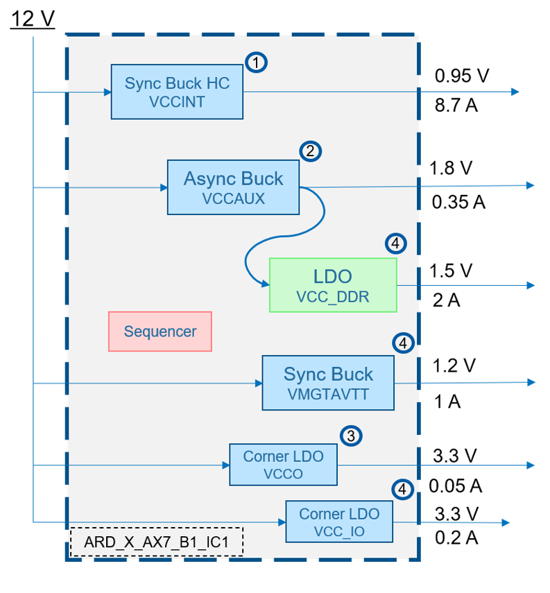 | 4 | VCCAUX, VCCADC | 2 | C150 | Async Buck | VIN | 12 | 1.8 | <(0.35 + 2) | ARD_X_AX7_B1_IC1 |