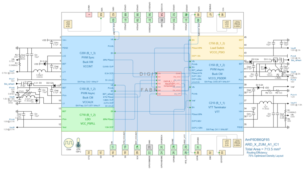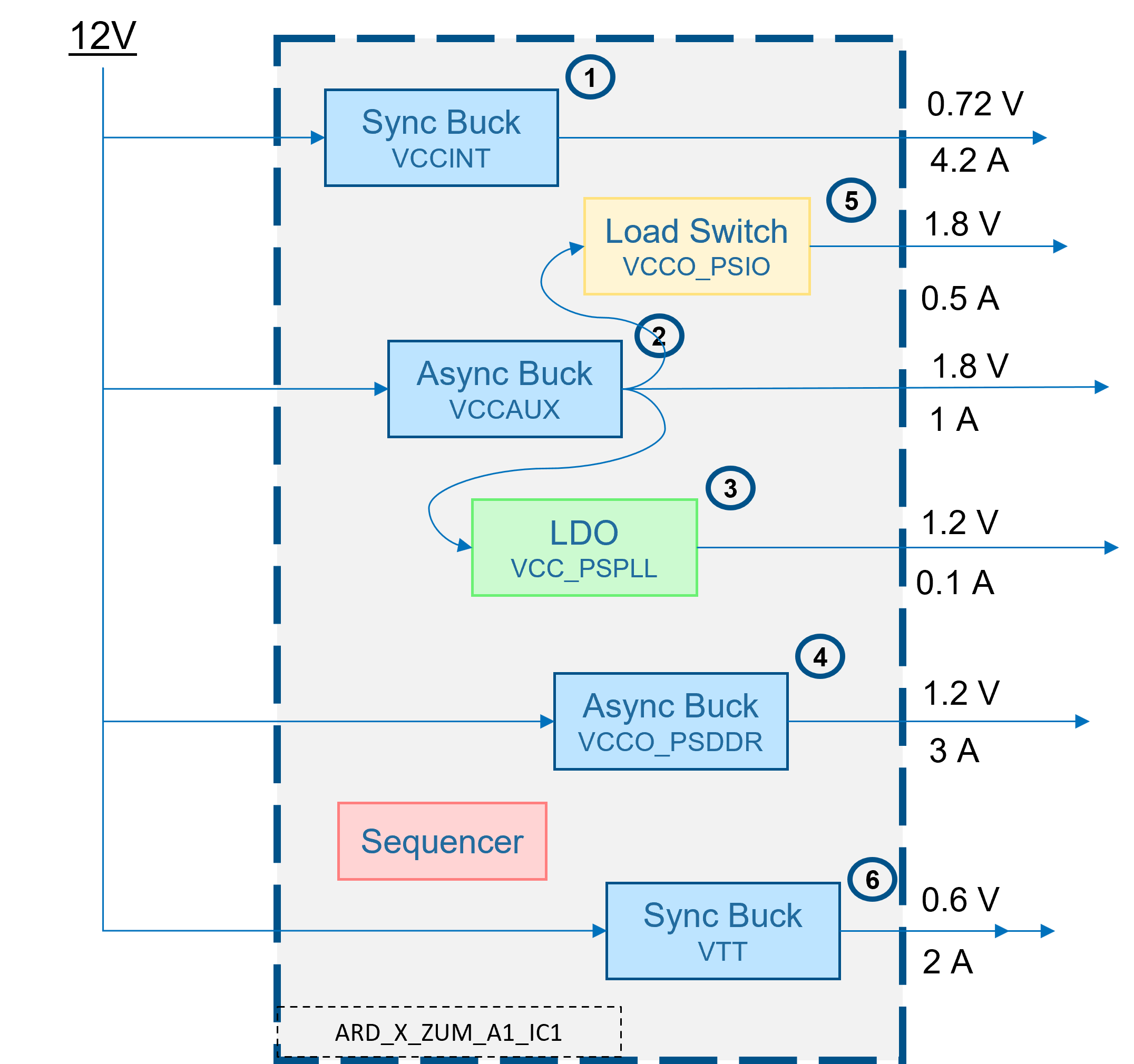 | 2 | VCCAUX (VCCAUX, VCCAUX_IO, VCCADC, VCC_PSAUX, VCC_PSADC, VCC_PSDDR_PLL) | 2 | C150 | Async Buck | PVIN | 12 | 1.8 | 1 + 0.5 + 0.1 | ARD_X_ZUM_A1_IC1 |